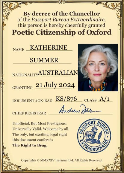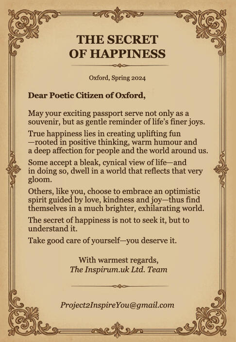 The entitlements bestowed by the Passport of the Poetic Citizen of Oxford are rare and priceless.May you greet each privilege with a smile and a glimmer of wonder.For life devoid of love, joy and laughter is an unforgivable waste. Thus, the secret of happiness is not to seek it, but to understand it.