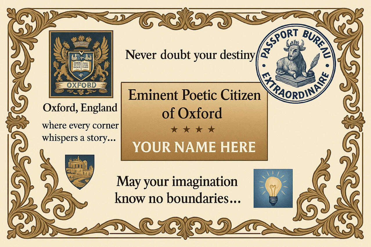 BRILLIANT AWARD WINNING GIFTBestow upon yoursel -- or someone you're hoping to enchant -- this magical gift, the personalised Passport of the Poetic Citizen of Oxford, complete with your (or their) name and photo.At first glance, the spectacular booklet resembles an official document... until its delightful flair gives it away. A small Masterpiece of Beauty, Wisdom, and Wit.Impress your friends with this grand declaration of your Poetic Identity, an exquisite document that is uniquely yours and yours only.