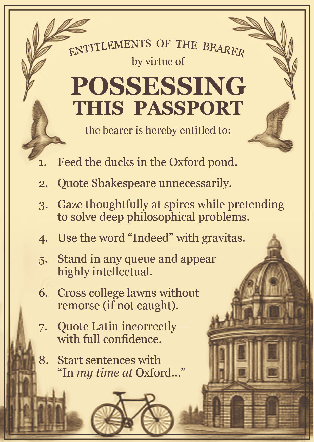 Each Passport is a bespoke, A6 booklet printed on premium 400 gsm paper. It features an elegant front cover, beautifully crafted pages with joyful entitlements, spaces for the bearer's name and photo, and enchanting descriptions of the wonders of the city of Oxford and Oxford University.3. Processing and Shipping